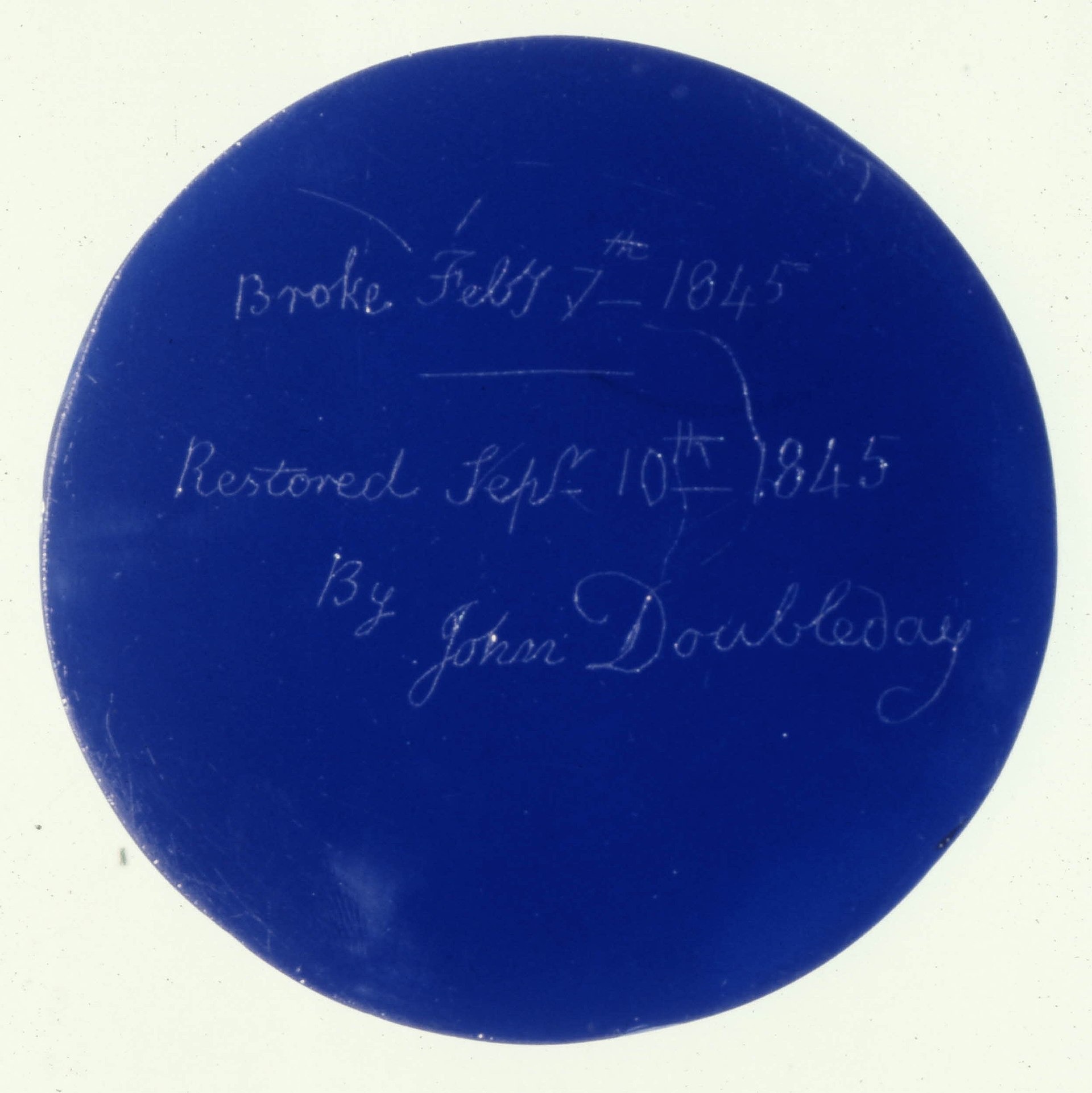 На новом базовом диске была выгравирована ромбовидная надпись: «Разбита 7 февраля 1845 года, восстановлена 10 сентября 1845 года Джоном Даблдеем».
