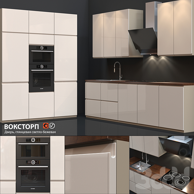 Удачные решения глянцевой кухни бежевого цвета . Фото подходящих фасадов, столешниц, ручек и кухонных моек с ценами . Дизайн кухонь с фасадами ВОКСТОРП от специалистов ИКЕА .
