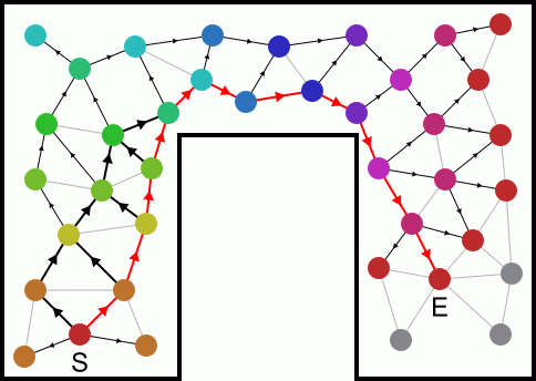 Для поиска пути по карте из текущей точки S к некоторой удалённой точки E используется механизм "волны огня". Начинается всё с активной клетки места, соответствующей текущему положению животного. Она передаёт активность связанным с ней клеткам, после чего на некоторое время переходит в неактивное, "выгоревшее" состояние. Активированные клетки делают тоже самое, при этом запоминая по каким связям к ним пришло возбуждение. Таким образом по графу прокатывается волна активности, на фронте которой происходит ориентирование задействованных связей.