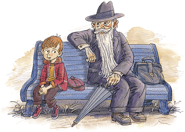 Маленький старичок с длинной седой бородой сидел на скамейке и зонтиком чертил что-то на песке.
