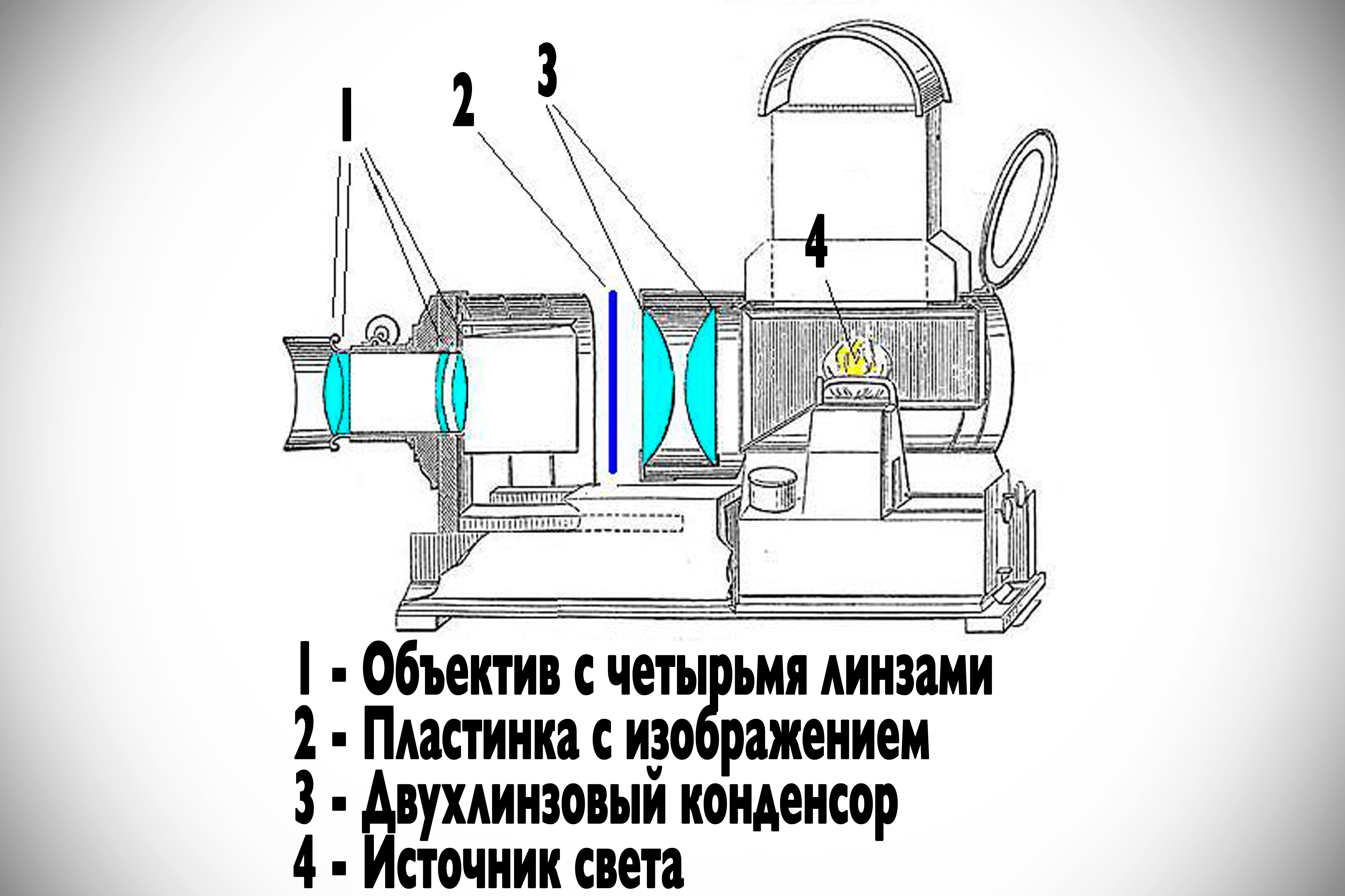 Конструкция, как видите, довольно простая. Изображение, нанесенное на пластину из стекла, проецируется через оптическую систему и отверстие в лицевой части аппарата.