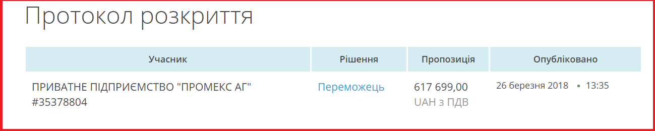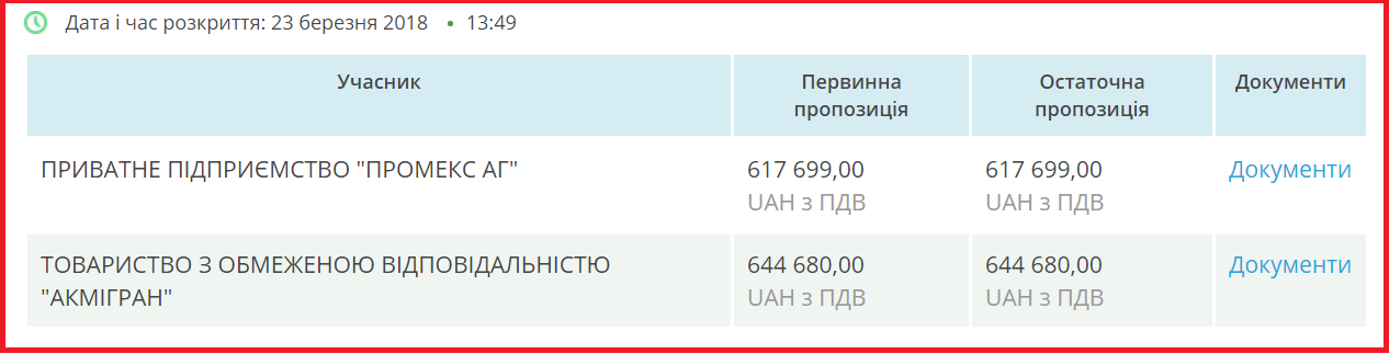 В итоге тендер выиграло ЧП Промекс АГ, предложив на 60 301 грн меньше ожидаемой стоимости КПИ.