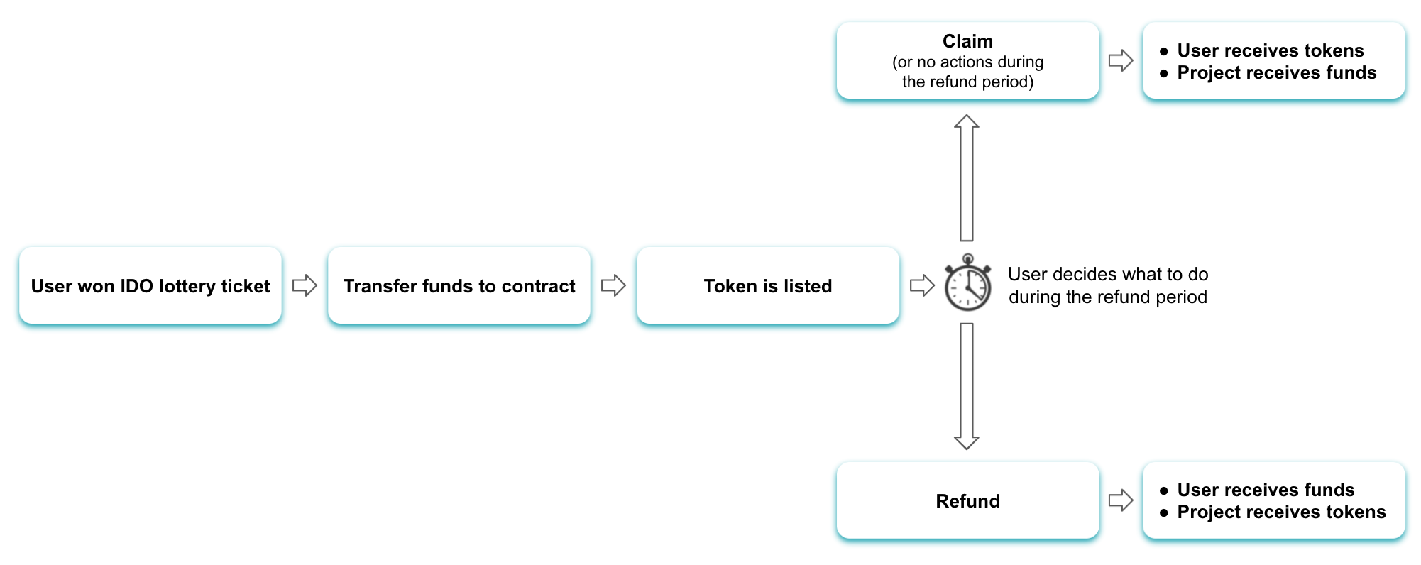 Возвратные IDO позволяют инвестировать в криптовалютные стартапы без сопутствующих рисков. Отныне после листинга проекта пользователь имеет право в любой момент времени в рамках установленного периода возврата (например 1 час или 24 часа) запросить внесённые средства.