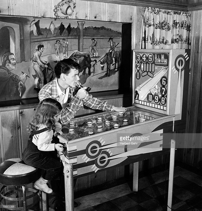 Фрэнк Синатра, его дочь Нэнси и его домашний пинбол, 1943 г.: