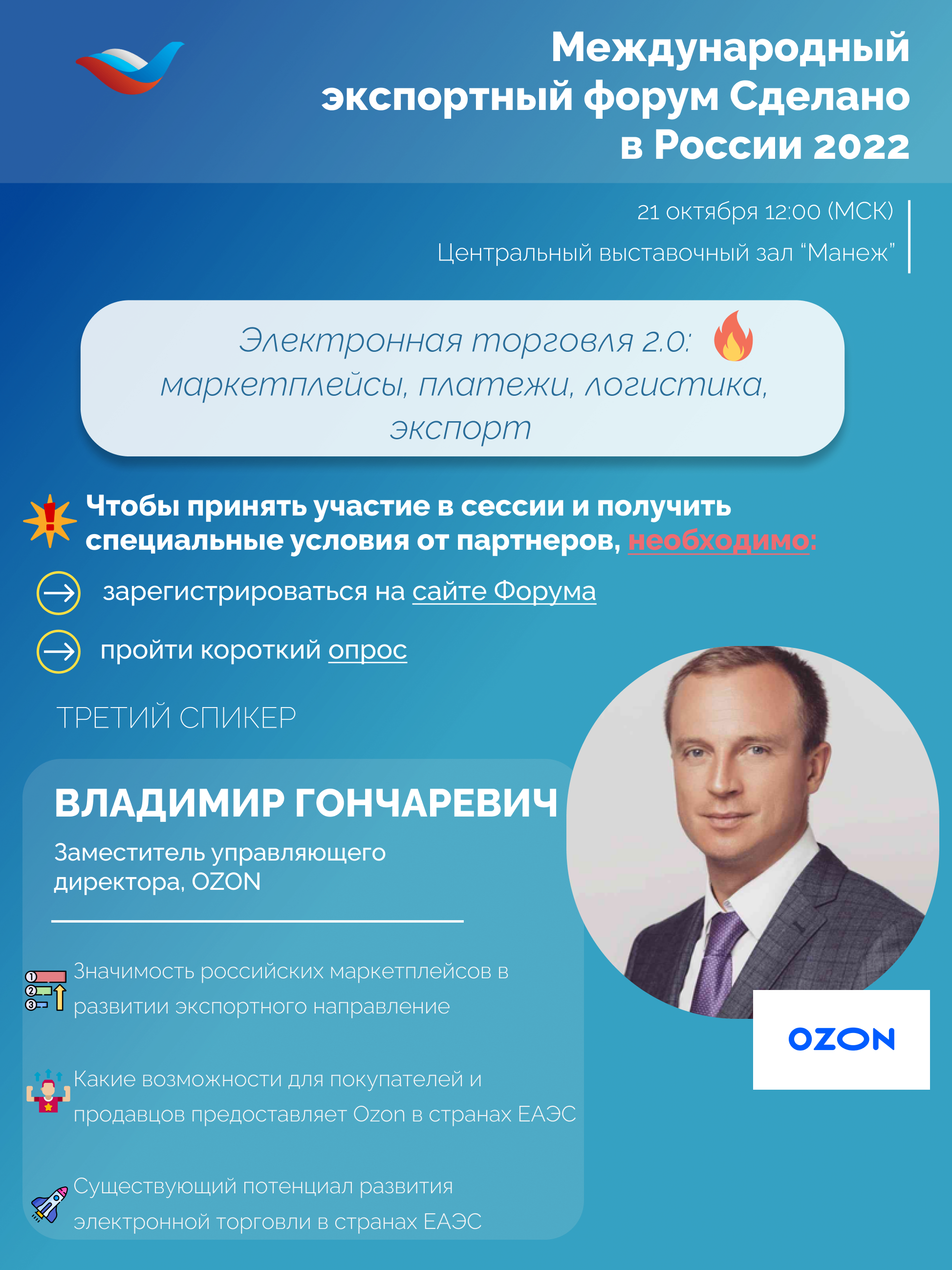 Чтобы принять участие в сессии "Электронная торговля 2.0: маркетплейсы, платежи, логистика, экспорт" на Форуме "Сделано в России" и получить специальные условия от партнеров, необходимо: