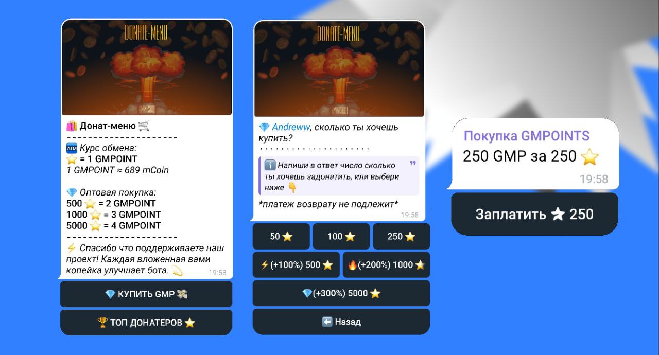 💎 GMPOINT — это вторая внутреигровая валюта в Мины Бот, которую можно приобрести исключительно за Telegram Stars.