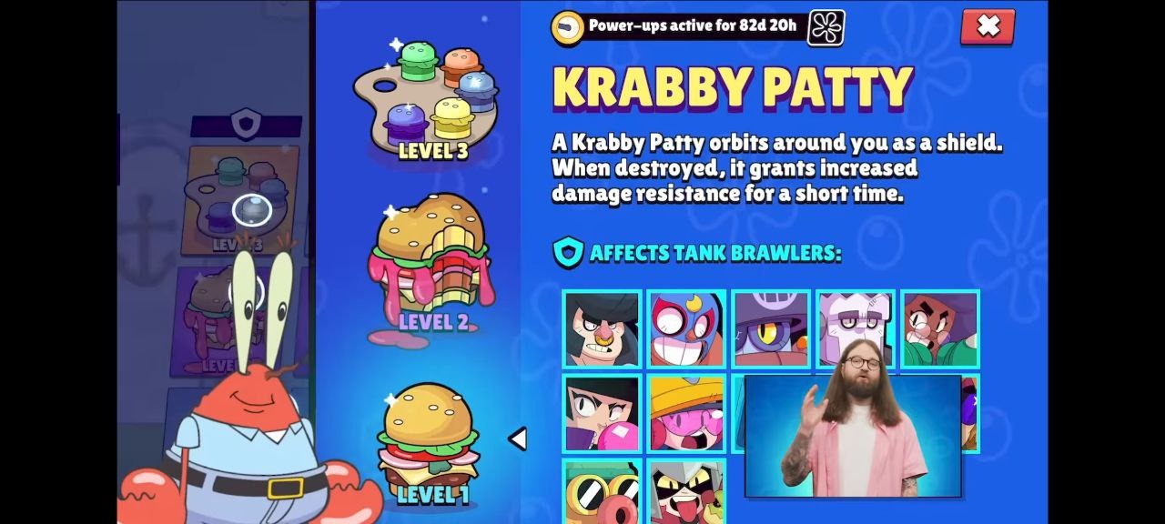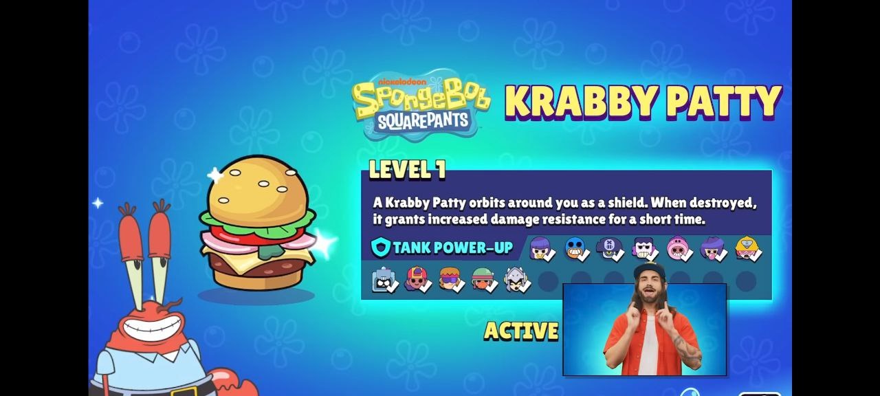 • Танк: вокруг бойца летают три крабсбургера. При их уничтожении боец получает сопротивление к урону, его скорость увеличивается,