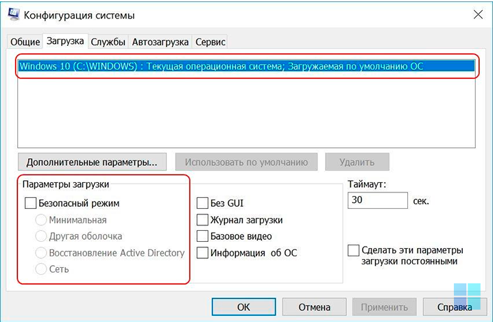 Также в данной вкладке можно активировать безопасный режим. По умолчанию в Windows 10 кнопка F8 не активна, и запустить сейф-мод можно только выполнив определенный набор процедур. Если же в параметрах загрузки отметить галочкой «безопасный режим», то компьютер автоматически перезагрузится в safe mode после нажатия кнопки «ОК».