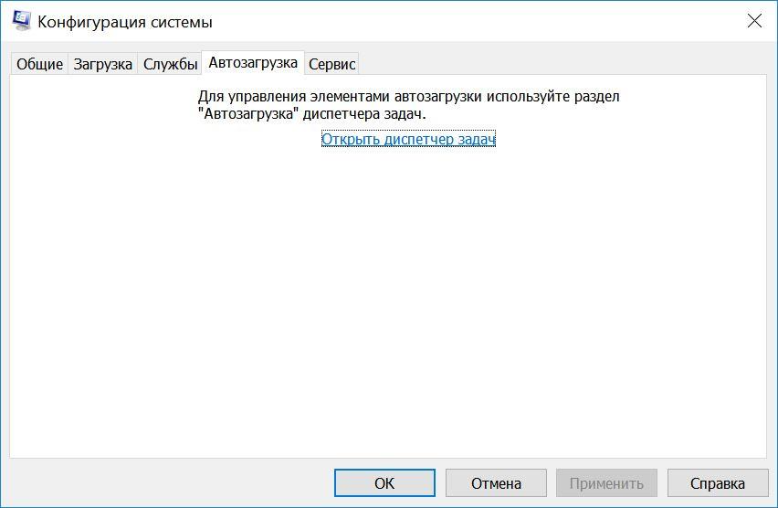 Автозагрузка – самая бесполезная вкладка конфигурации системы, отсылающая нас к диспетчеру задач. В предыдущих версиях Windows в этой вкладке можно было убрать любую программу из автозагрузки ОС.