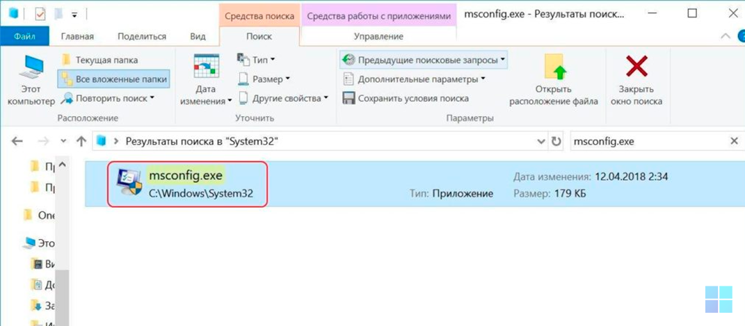 Следом открываем директорию Windows\System32 и в строке поиска в верхней правой части вводим текст msconfig.exe. По окончанию поиска запускаем найденный файл msconfig.exe двойным кликом левой кнопки мыши.