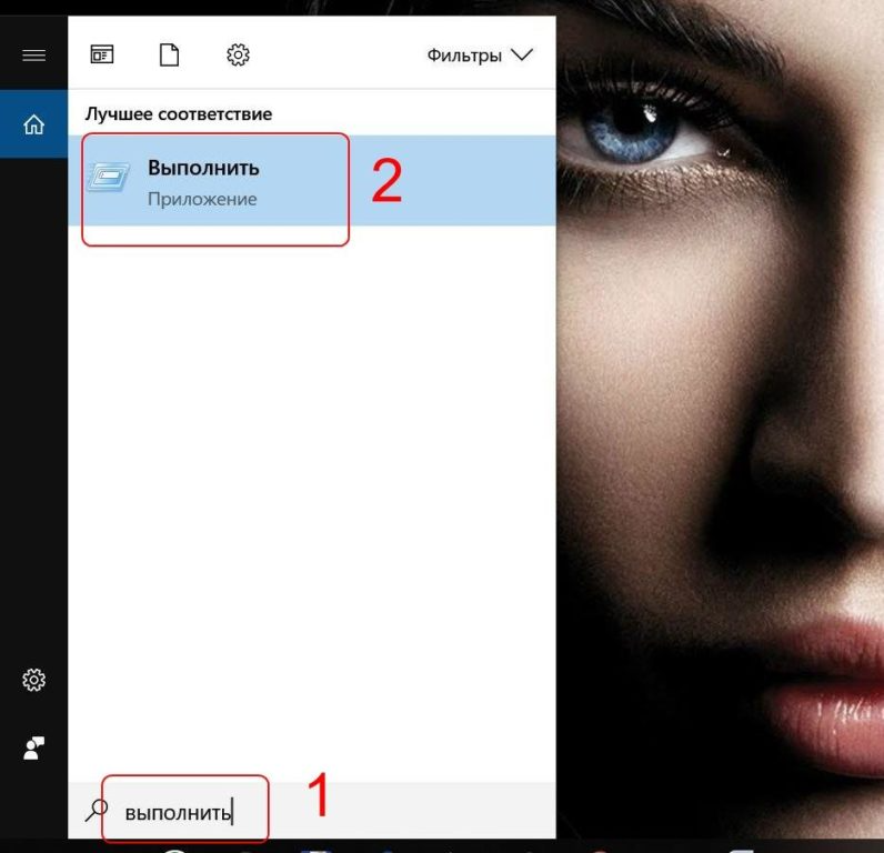 Третий способ схож с вышеуказанным и отличается лишь дополнительным действием. Кликаем иконку поиска рядом с меню «Пуск», вводим слово «Выполнить» и выбираем предложенную программу с таким же названием.