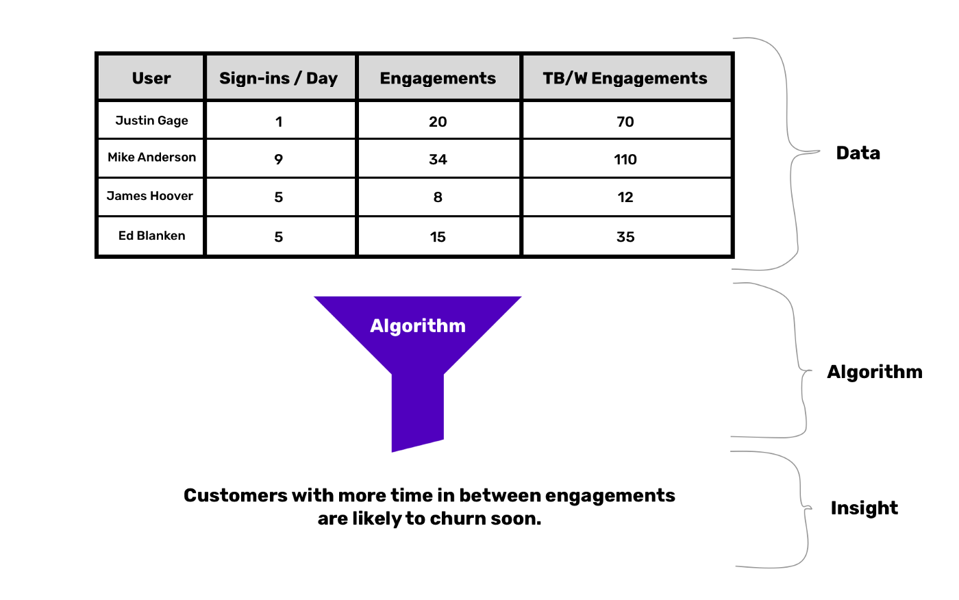 Пример оттока: данными может стать прошлая активность пользователя. Данные обычно организованы в виде строк со столбцами, представляющими их особенности (диаграмма выше).
