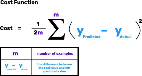 Мы начнем с функции потерь — способа оценить, насколько хорошо мы справляемся с поиском отношений. Другими словами, это помогает нам определить, насколько плохи наши прогнозы, чтобы мы могли работать над их улучшением. Функция потерь зависит от того, какой алгоритм вы используете. Для линейной регрессии она представляет собой следующее: