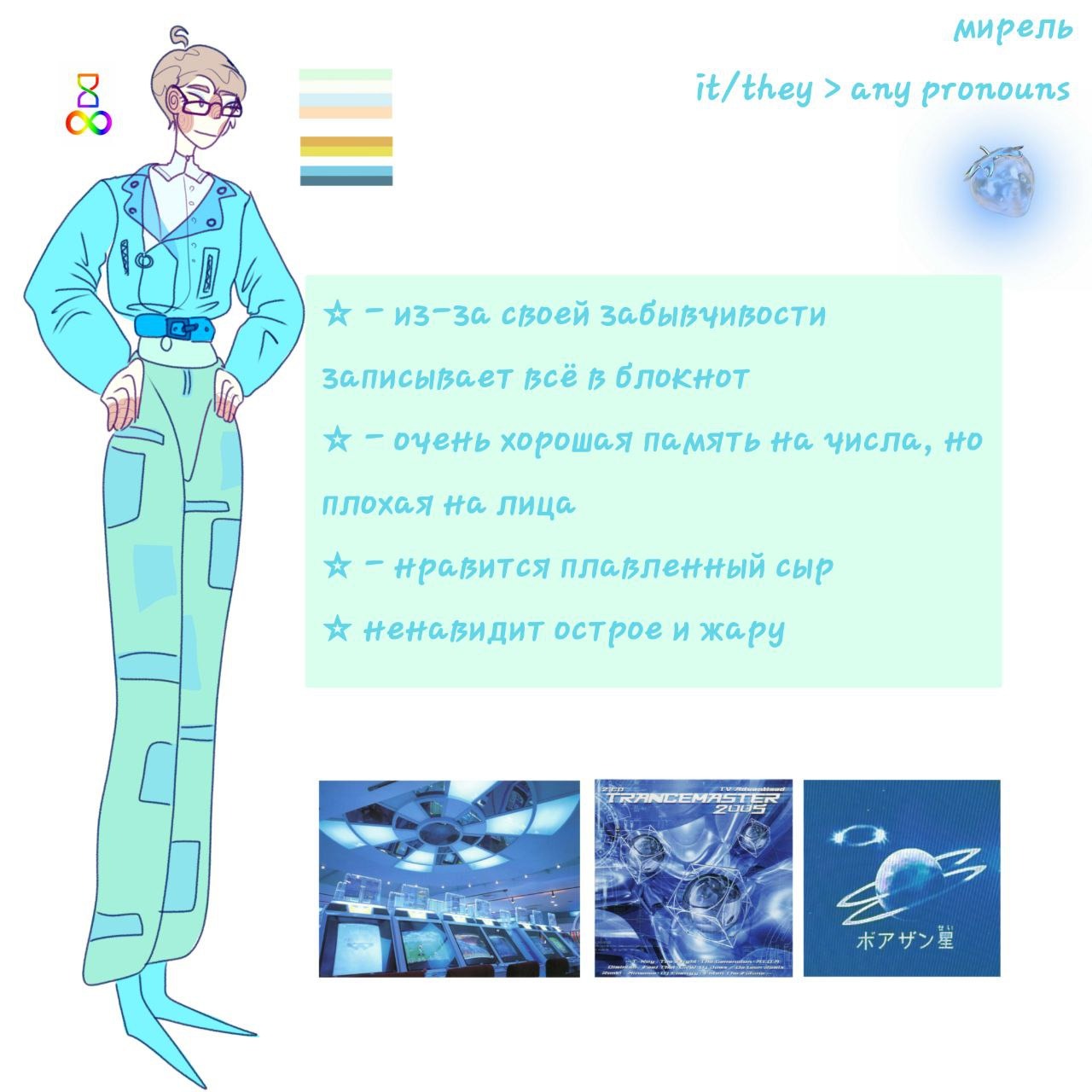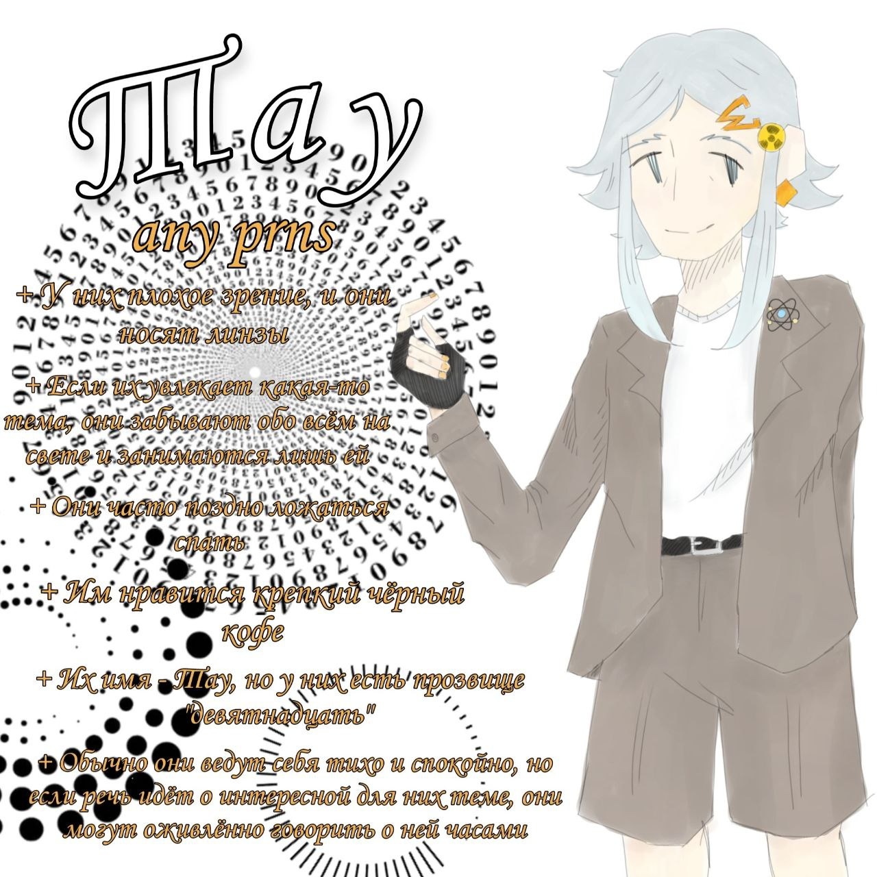 Любит крепкое кофе, классическую музыку(но бесится под рок >:] ), смотрит научпоп на ютубчике вечерами