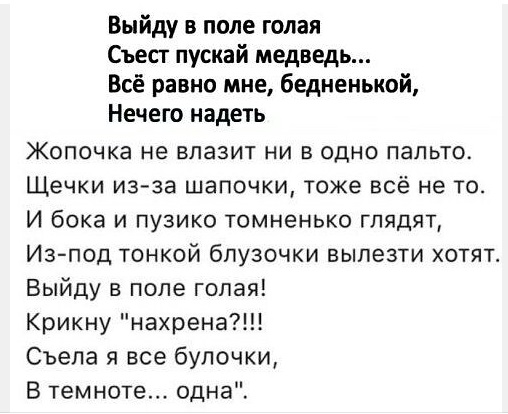 Выйду в поле голая Съест пускай медведь . . . Все равно мне, бедненькой, Нечего надеть . Жопочка не влазит ни в одно пальто . Щечки из-за шапочки, тоже все не то . И бока, и пузико томненько глядят,