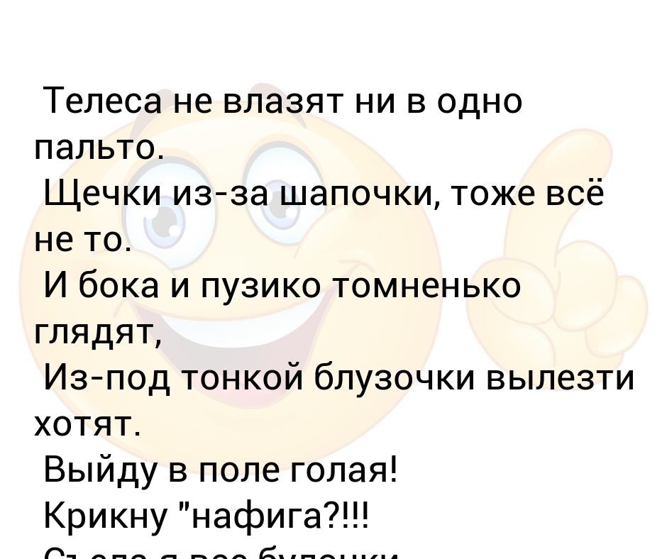 Выйду в поле голая . .Съест пускай медведь . . .Всё равно мне,бедненькой,нечего надеть . Жопочка не влазит ни в одно пальто,щёчки из-за шапочки,тоже всё не то . Не хочу я яблочки, так же огурец . . .