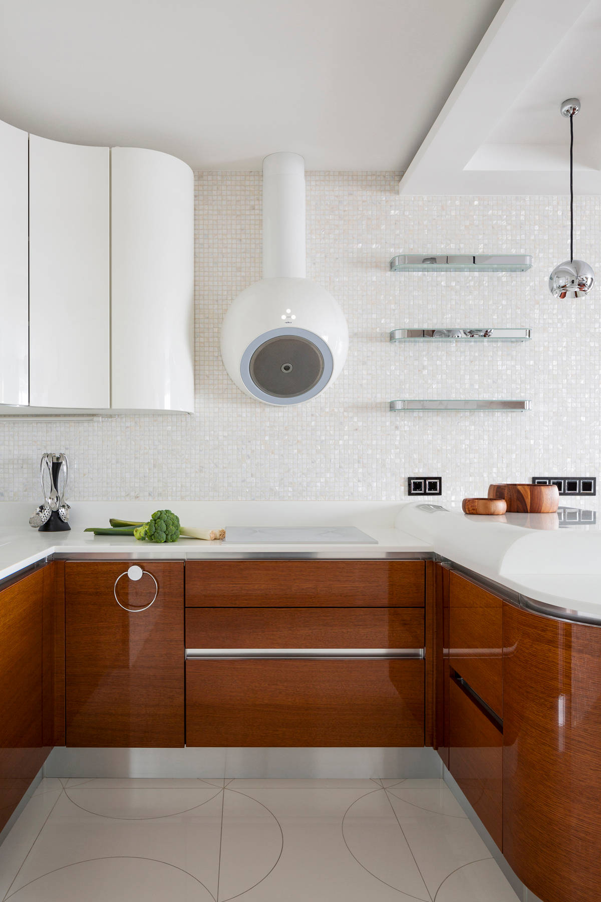 На фото использование иллюзии с зеркальной пленкой . Идеи дизайна в интерьере . Вытяжка в интерьере кухни станет гармоничным дополнением к дизайну, если подобрать правильную модель .