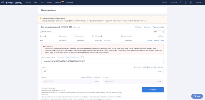 7) Нам понадобиться немного ETH для оплаты транзакции(я пополню MEW через биржу Huobi), если у вас уже есть ETH на кошельке, то переходите сразу на 10 шаг: