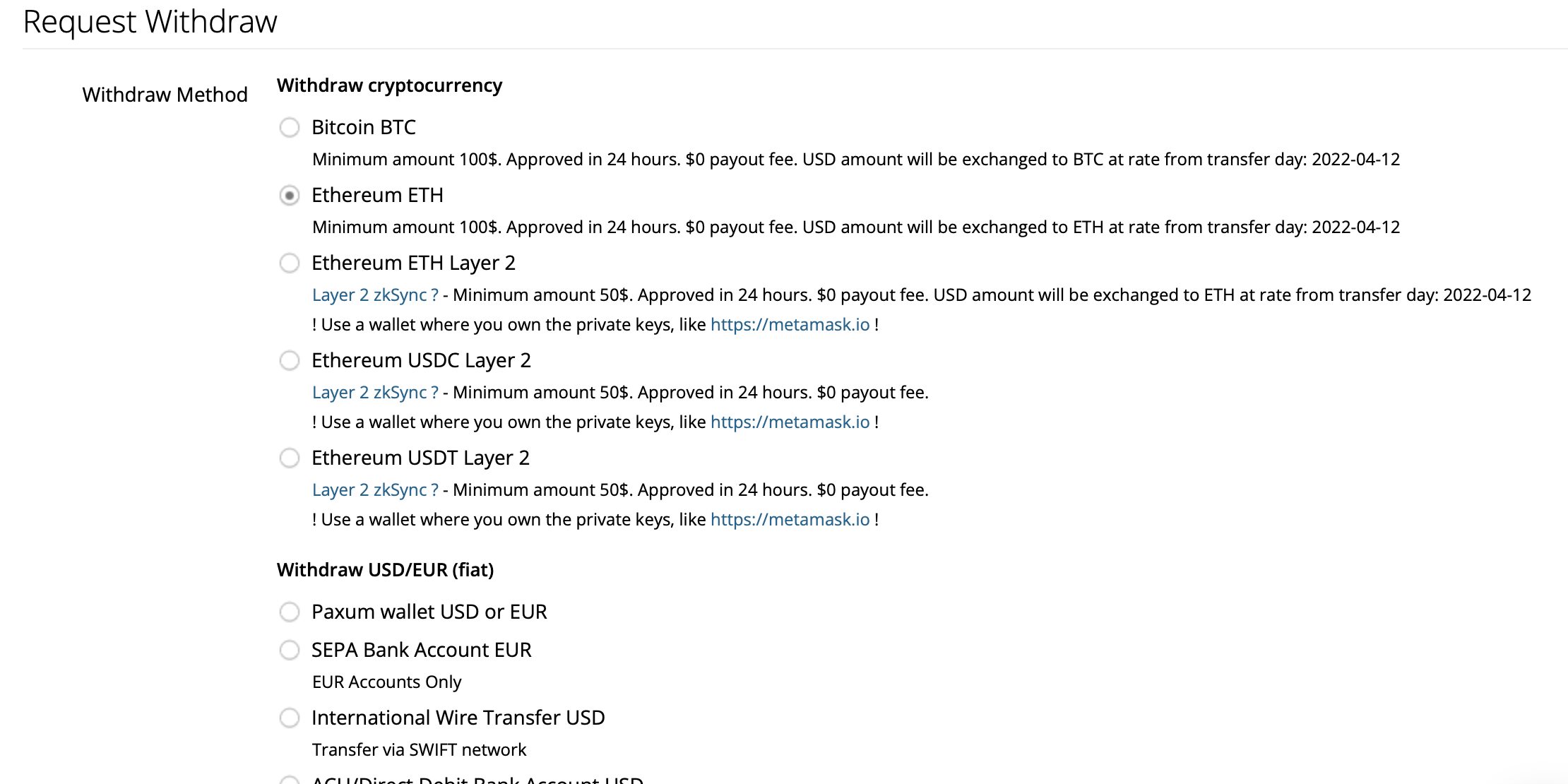 Не так давно ресурс добавил возможность вывода в криптовалюте. В данный момент поддерживаемые токены: BTC (Bitcoin), ETH (Ethereum), Ethereum ETH Layer 2, Ethereum USDC Layer 2 и Ethereum USDT Layer 2 ( то есть, SkyPrivate поддерживает вывод на стейблкоины (USDC и USDT) от ETH.