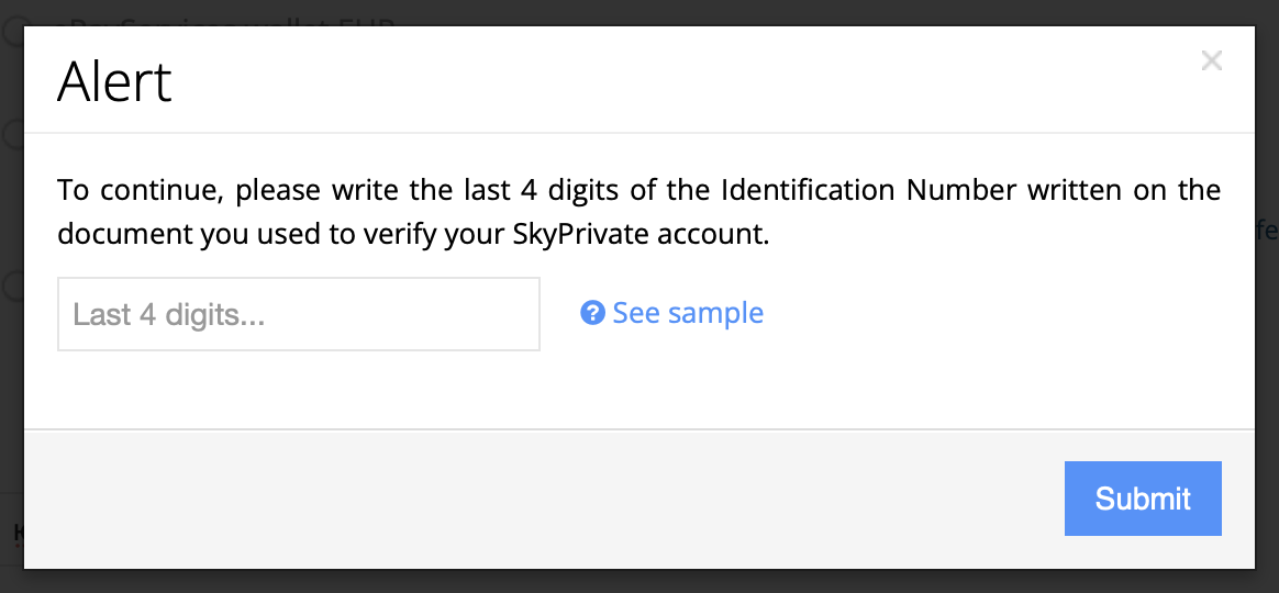 Теперь необходимо нажать “Submit” (мы вернулись в раздел Payments на SkyPrivate) и верифицировать свой аккаунт по последним четырём цифрам документа.