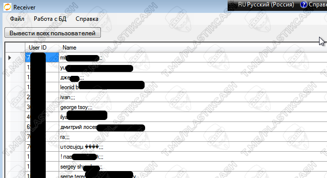 Получаем наш дамп-файл и переходим к программе. Аналогично загружаем БД и отображаем всех пользователей. Получаем три значения: уникальный идентификатор (uid), имя и информацию в двоичном виде. В последнем столбце, среди двоичного кода есть также номер телефона. Сначала производим поиск по имени (все имена расположены в алфавитном порядке, сначала EN, а потом RU), затем получаем uid и фильтруем сообщения по этому параметру. Таким образом, получаем конкретные сообщения от отдельного пользователя.