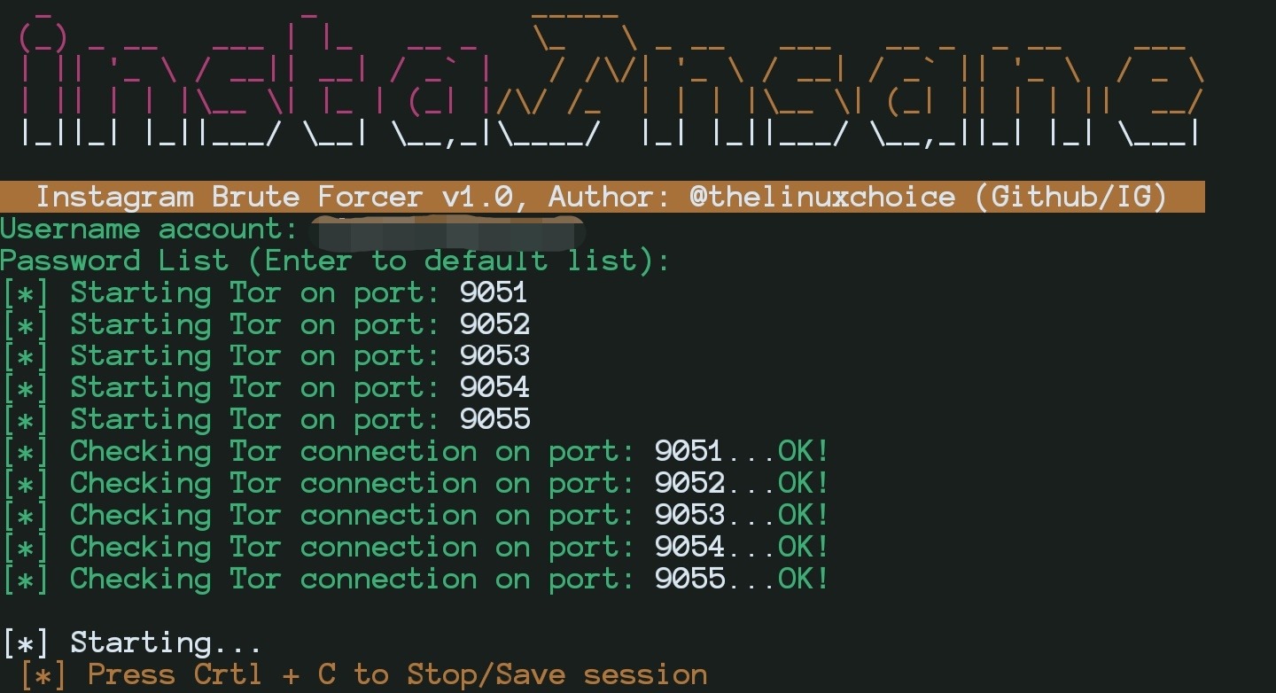 После указания никнейма и словаря для брута начнется запуск мульти-тор, его проверка, и только потом запуск перебора паролей.