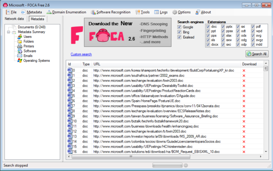 В данном способе будем использовать программу FOCA. Это такой мощный инструмент для извлечения и анализа метаданных. Так вот, Foca может извлекать данные из файлов Microsoft Office, PDF файлов, графических файлов и т.д. Foca может вытаскивать подробную информацию о месте где производилась фотосъёмка по сохранённым GPS данным.