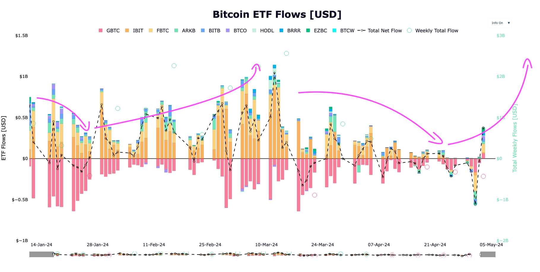 - This Friday, the US bitcoin spot ETFs made a very solid bid (+$378m netflow) after a negative period, exactly as in January (they were being knocked down by GBTC's outflows), even resulting in GBTC's first positive netflow, and this could be the beginning of a new accumulation trend. In the case it happens, we can make 2 very clear observations: