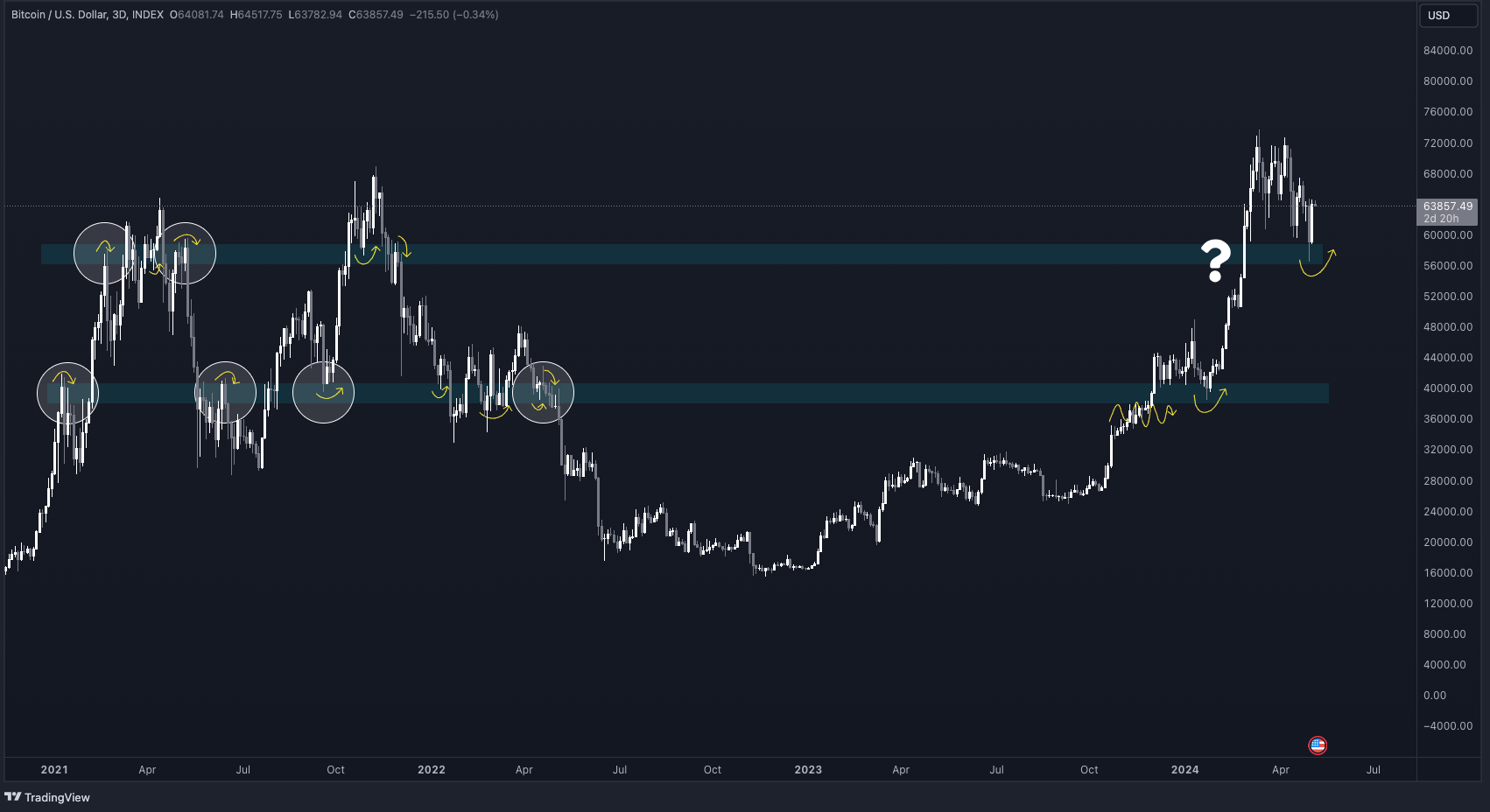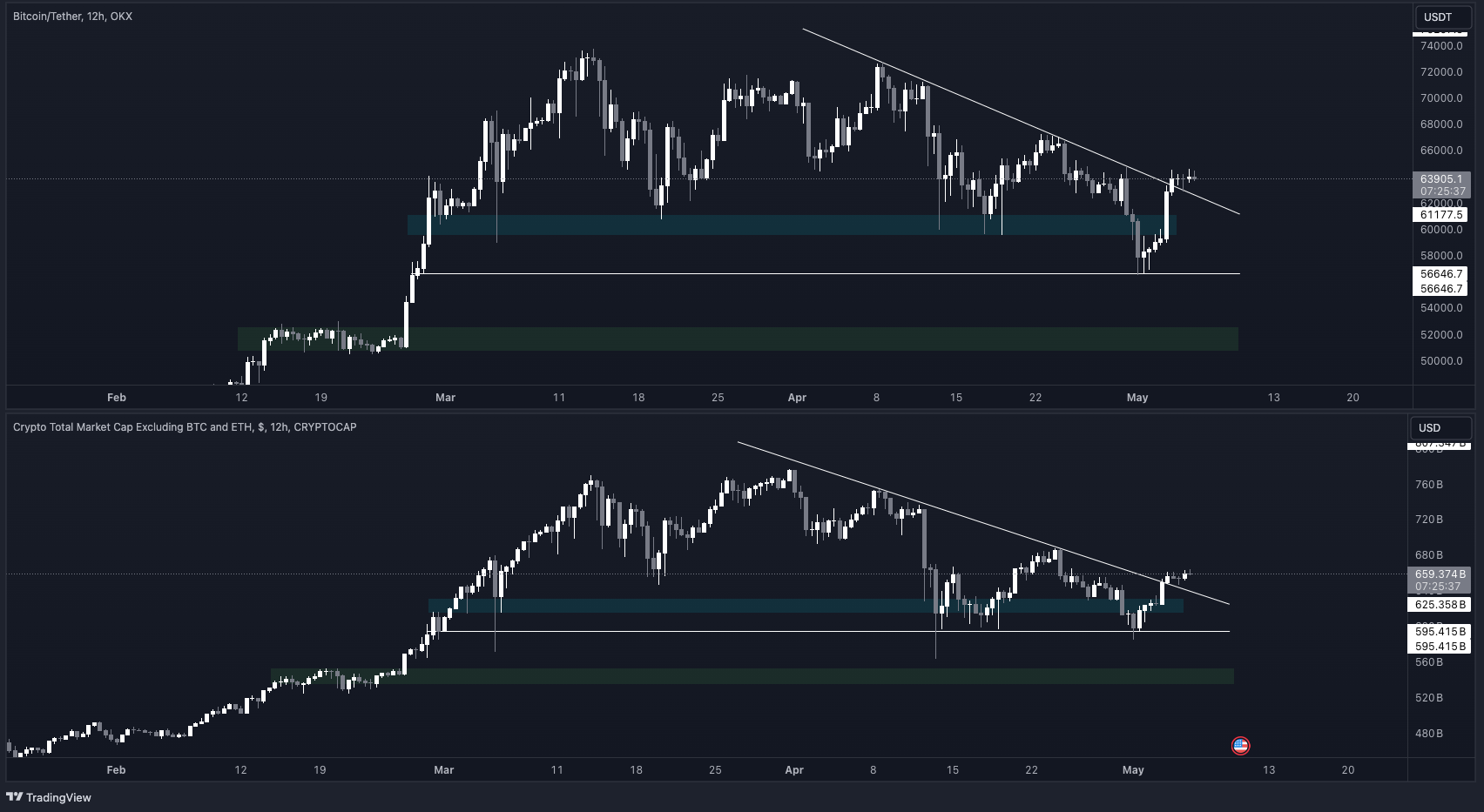 Bottoming at 57k is equally important on HTF, but less so in the short term: