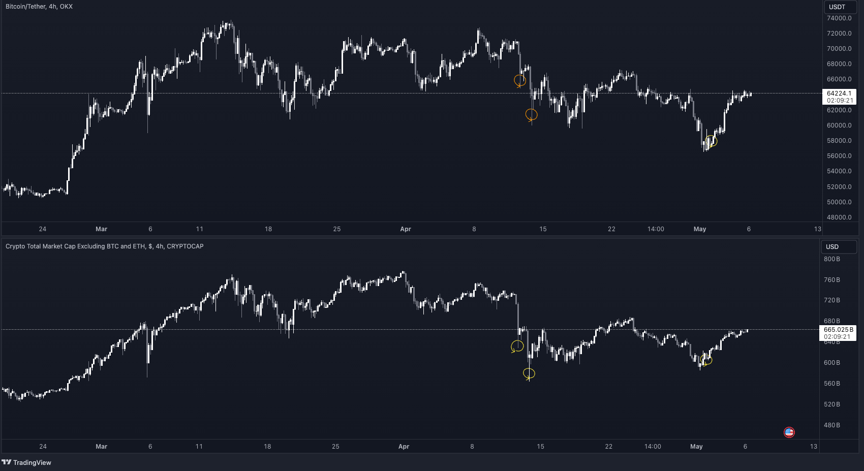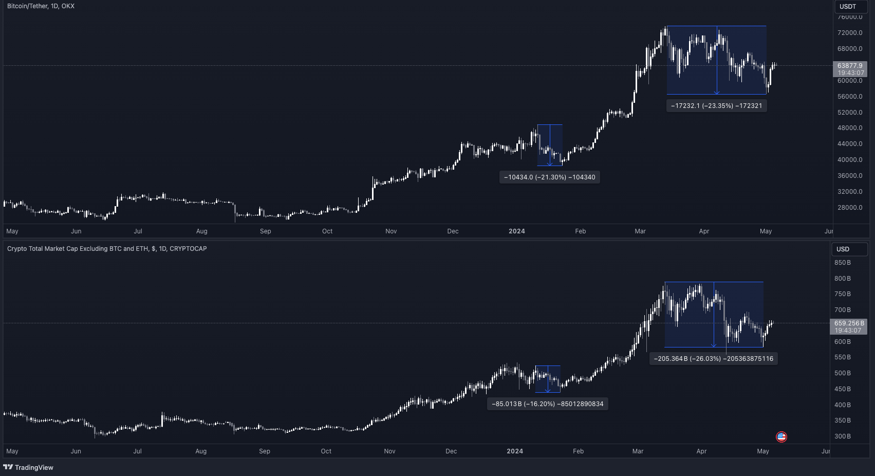 Total3 actually lost 29.1% with the April 12/13 dump during the Middle East conflict, but I preferred to use the same bitcoin range to better compare the dumps