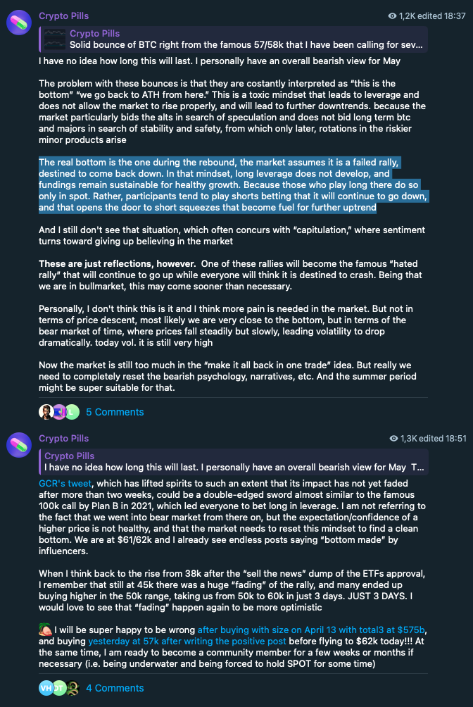On Saturday I may have been “overly bearish,” forcibly looking for behavior in the market that may have already happened, and I am the first to have represented it in these words: "The real bottom is the one during the rebound, the market assumes it is a failed rally, destined to come back down. In that mindset, long leverage does not develop, and fundings remain sustainable for healthy growth."