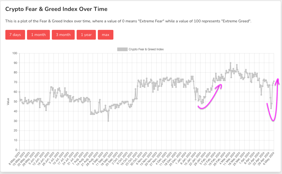 But unlike back then, I think it is much easier today to see funding rising again, because the underlying sentiment remains extremely bullish, and so it is very easy for the market to return to the orderbook to long euphorically. This is one of the few cases where it makes sense to look at the fear and greed index, which shows that fear was really short-lived in the $57k dump, unlike the January trend that took weeks to recover: