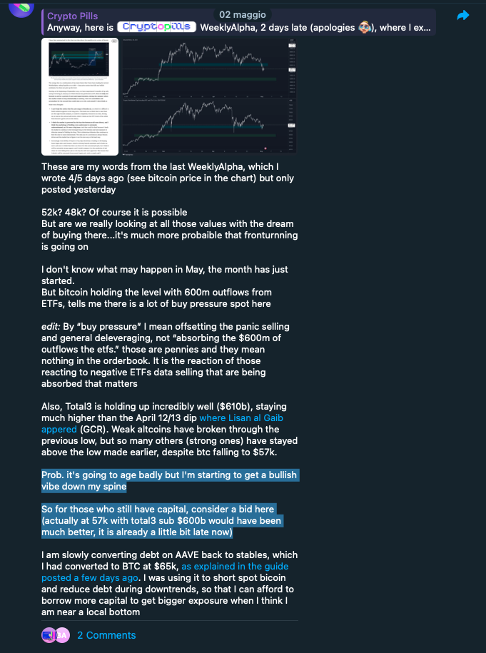 With a tiny bit of delay (BTC already approaching 58k when I published), I communicated my third buy zone (I had sold a few altcoins higher around $65k just before + borrowed new capital from AAVE to fund myself)