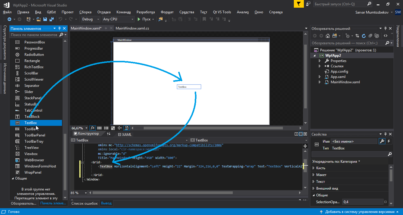 XAML teglari orasida TextBox uchun kod paydo bo’ladi