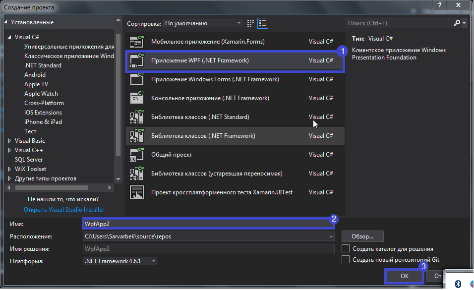 1. Yangi ochilgan oynadan WPF dasturini tanlang