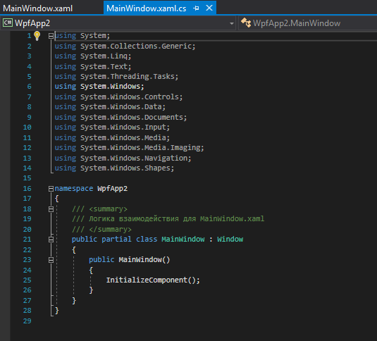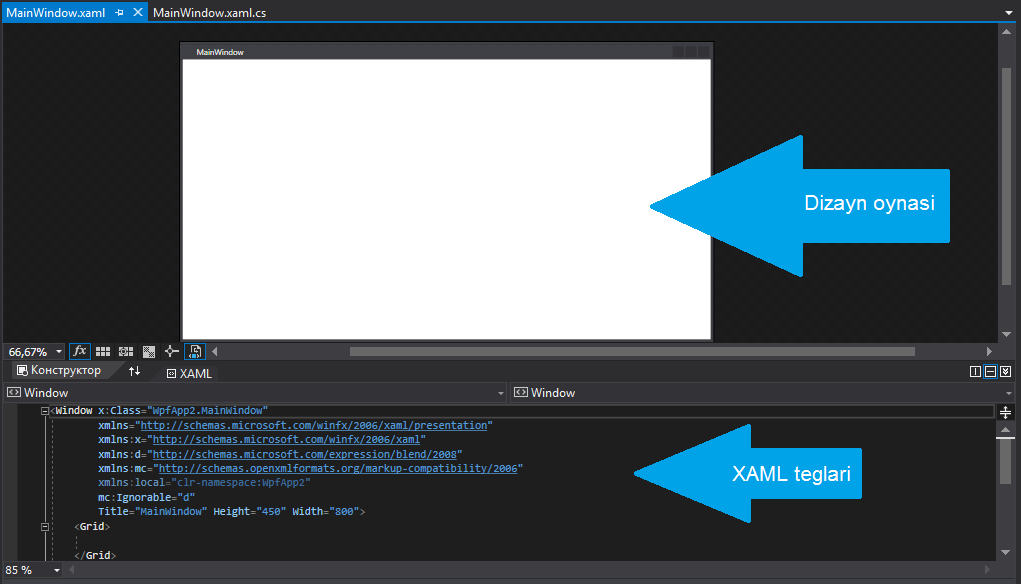 MainWindow.xaml, dizayn oynasi va XAML teglari oynasini o’z ichiga oladi