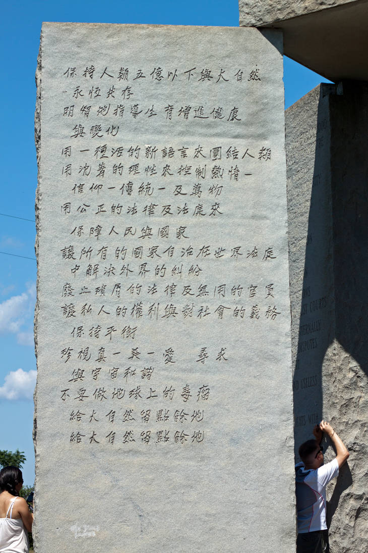 咱们讲更有名的引导石,美国乔治亚州,艾尔伯特县,有个叫,美国乔治亚州引导石。也叫,美国巨石阵。这个引导石,更有名,为什么更有名呢?因为中共喜欢讲,中共有些御用学者,喜欢拿这个来攻击西方,灭我中国之心不死。这个引导石,它上边刻着十条戒律,说给末劫之后的人类。第一条,就说了,将世界人口,保持在五亿之下,与大自然和谐永存。那中共就说了,西方阴谋组织共济会,就是要把人都杀光的。它们要把全世界杀的就剩下五亿。这不是邪教吗?这不是罪恶吗?这就是它们的铁证。