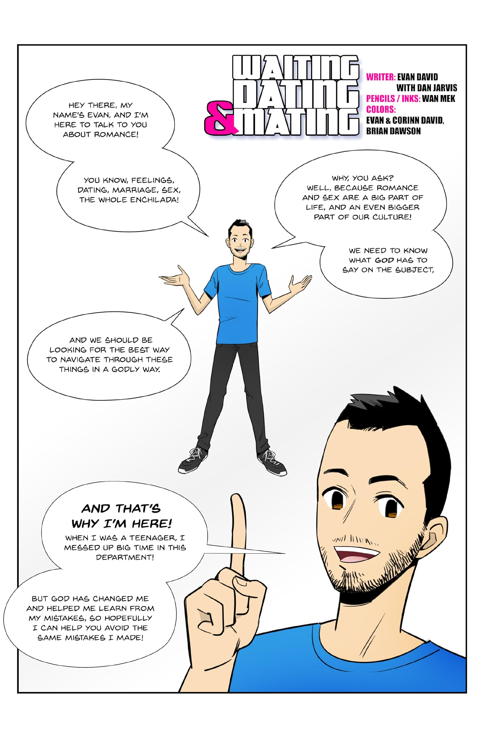 Waiting , Dating & Mating Published 2019-08-14 Evan David brings his Biblical purity message for middle and high schoolers into vibrant color in this educational comic .