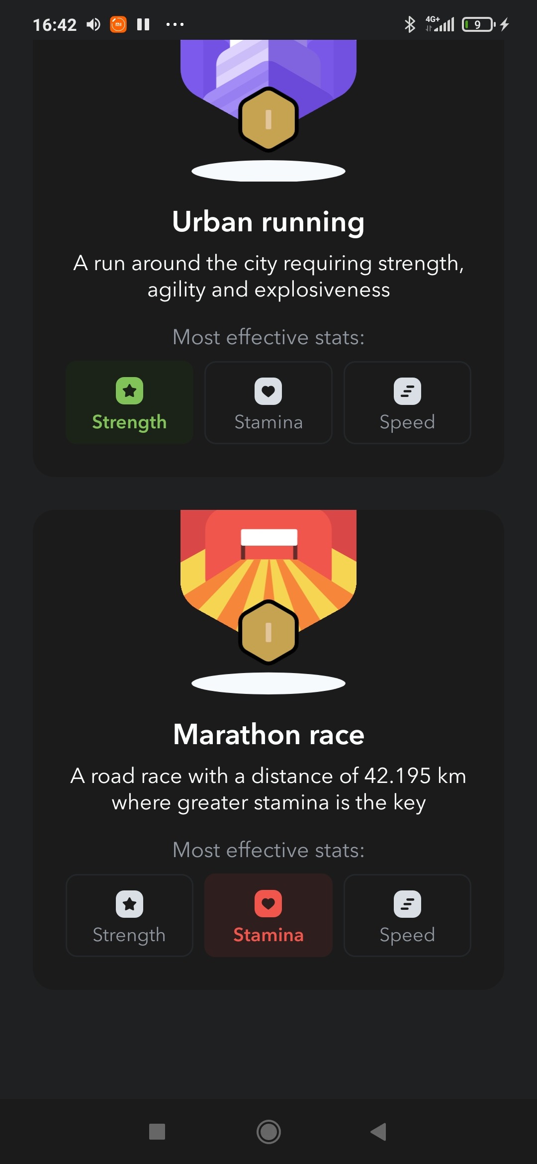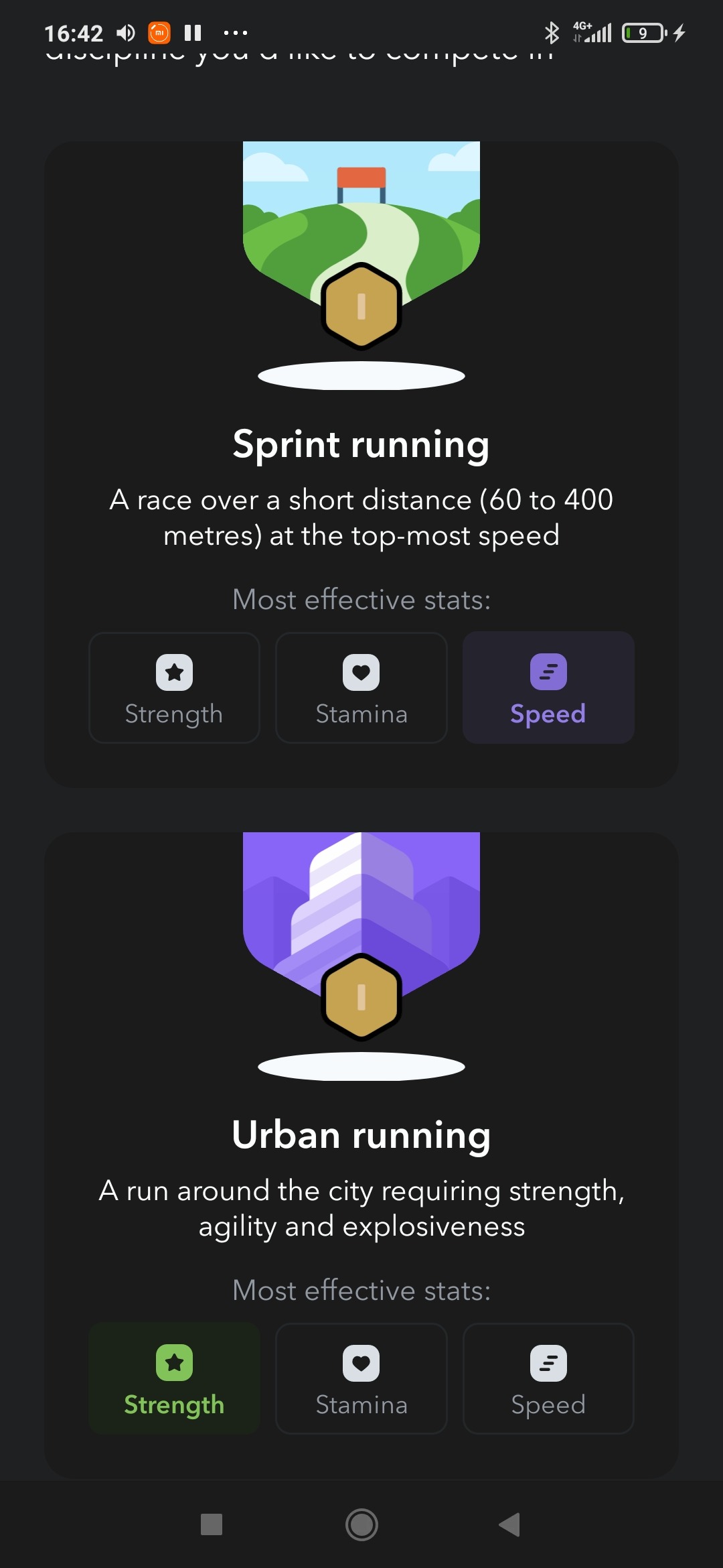 В каждой лиге для участия доступны три дисциплины: Sprint running, Urban running, Marathon race. В дисциплинах подсвечивается та способность персонажа, которая больше всего развита