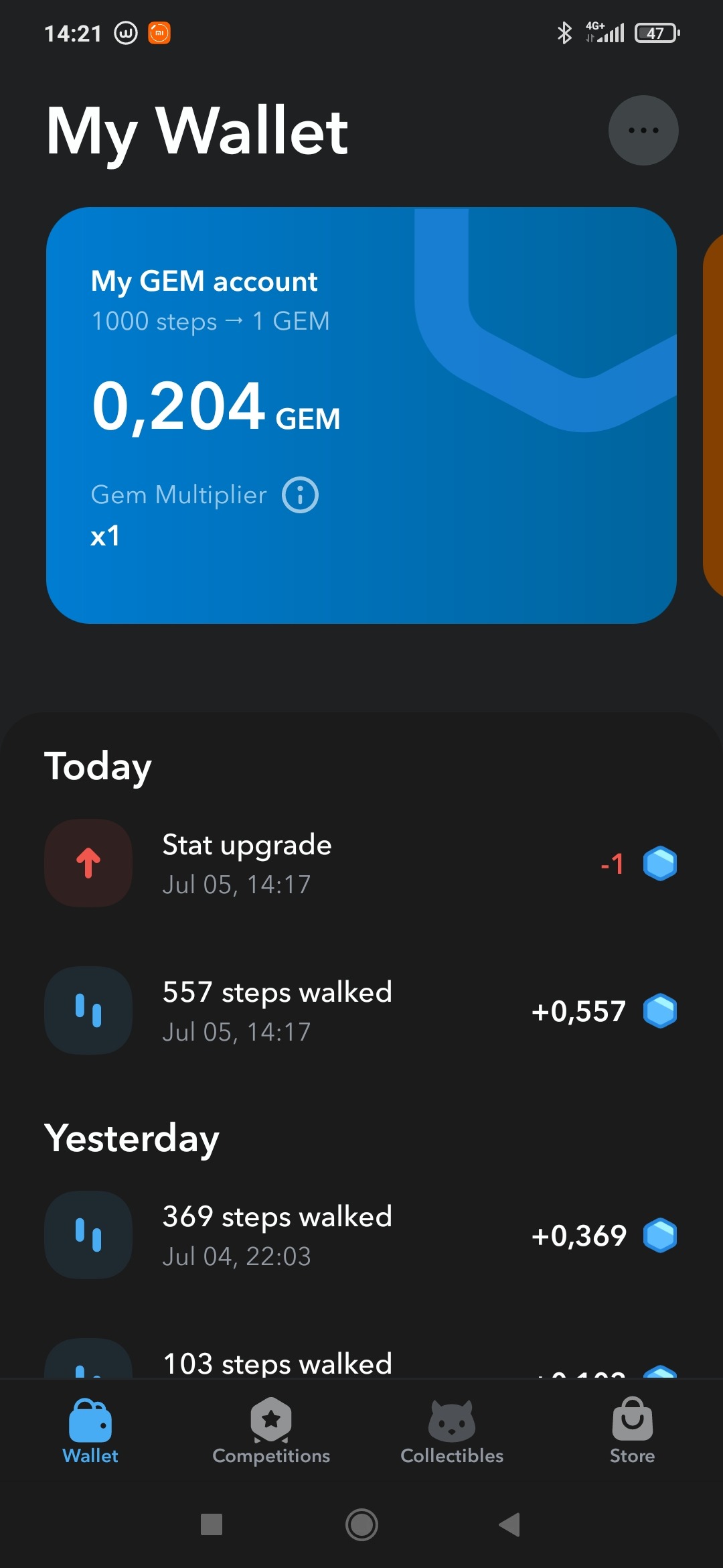 Здесь ваша активность будет преобразовываться в гемы, по курсу 1000 шагов = 1 гем. Также здесь указана статистика вашей активности и число гемов на кошельке