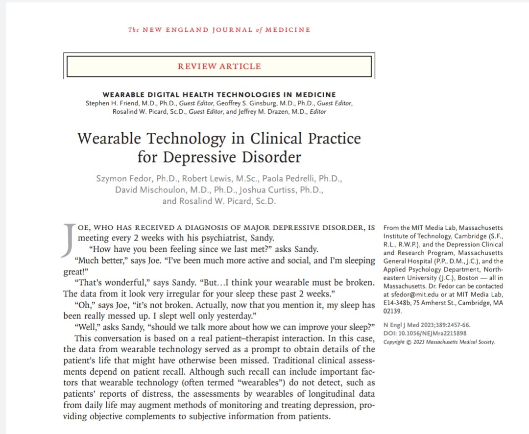In this case, the data from wearable technology served as a prompt to obtain details of the patient’s life that might have otherwise been missed.Wearables enable passive monitoring (i.e., monitoring without active input) of behavioral and physiological factors. The greater frequency and objectivity of wearable measurements help overcome some of the limitations of adherence and bias when depression is monitored exclusively with self-reports Complementing patient self-reports, these measurements increase the information available for differential diagnosis or treatment planning Furthermore, these measurements may enable patient subtyping12 on the basis of similar behavioral or physiological types, which can subsequently be associated with treatment outcomes.Data from wearables can help clinicians com-pile a more comprehensive view of a patient’s condition and identify potential targets for intervention, This vignette also illustrates how objective data can engage patients, improve their understanding of their condition, and potentially motivate them to try a treatment.Data from wearable devices may allow clinicians to monitor changes in behavior and symptoms more accurately between visits, and such monitoring may indicate whether a patient has had a response to medication, has adhered to therapy, or has had a relapse.