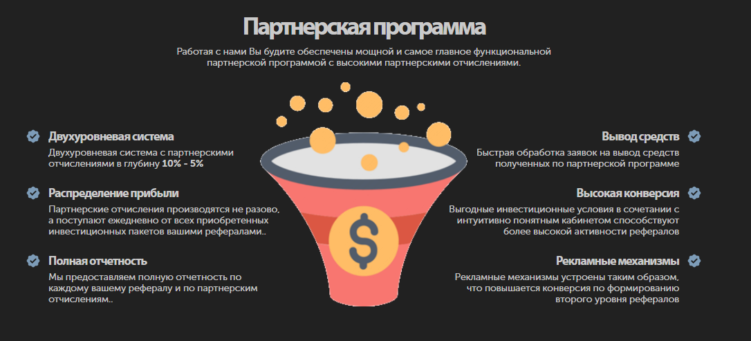 •партнерская программа на проекте 2-уровневая, доходность от привлечения рефералов составляет 5-10%;