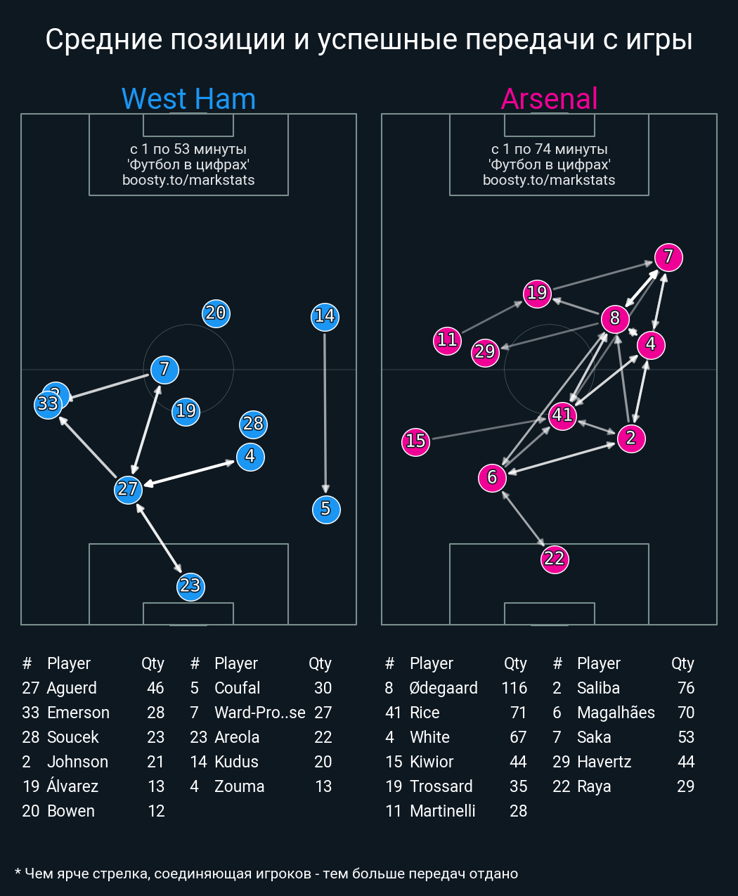 75 успешных передач из 77 попыток (1 под удар, 7 с продвижением, 1 на трети соперника)
