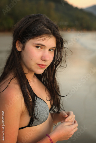 Attractive happy young teenage girl posing in a wet bikini . The child with long chic dark hair and a beautiful slender body smiles charmingly . Lovely pre- teen female stands barefoot in swimsuit . Cute teen girl in the sea . Pretty surfer girl at the beach . Teenager . Smiling teen girl . Little girl making funny face . Woman legs sunbathing on the beach . Teenage girl laying in the sea wate . . .