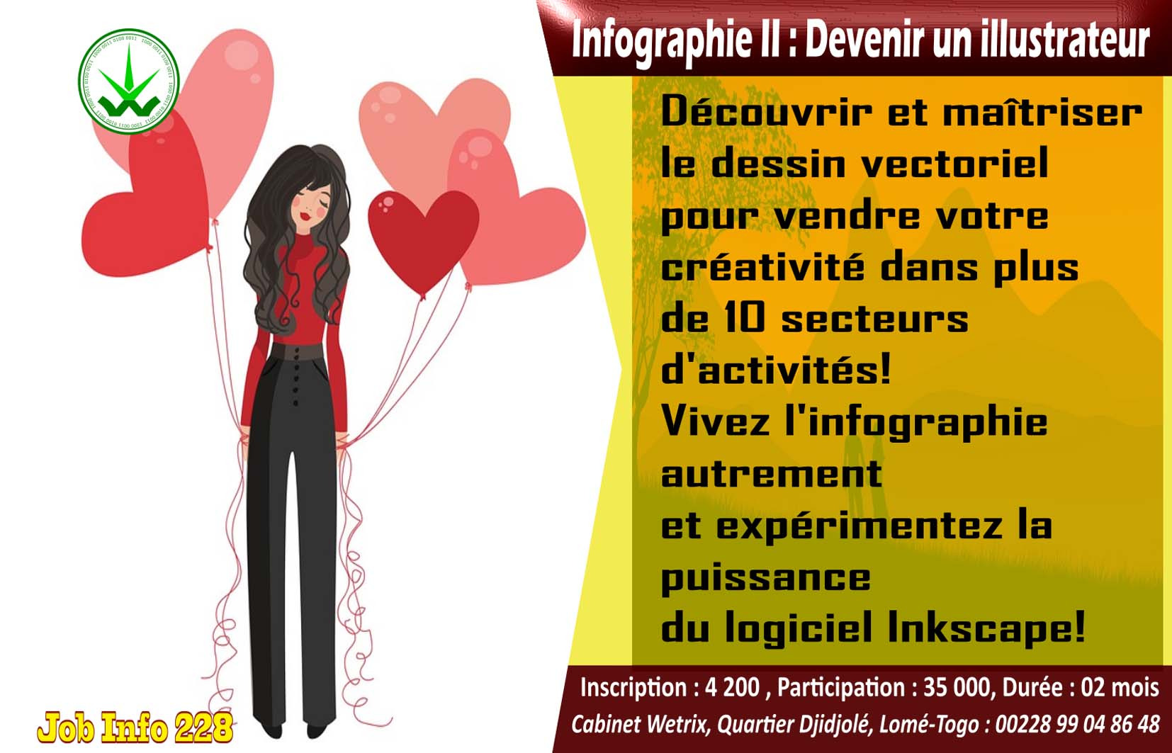 Que ce soit en agence de publicité, de presse…l’illustrateur est chargé de traduire un texte en de magnifiques dessins. C’est avant tout un artiste et déjà avec du crayon il peut faire des merveilles et nous allons montrer comment produire des dessins vectoriels sur un ordinateur. Il s’agit d’un type d’infographie qui intervient dans plusieurs domaines (voir les ateliers). Que vous soyez infographiste débutant ou expert, cette formation apportera une belle expérience à votre créativité et élargira vos horizons d’emploi ou de prestations !