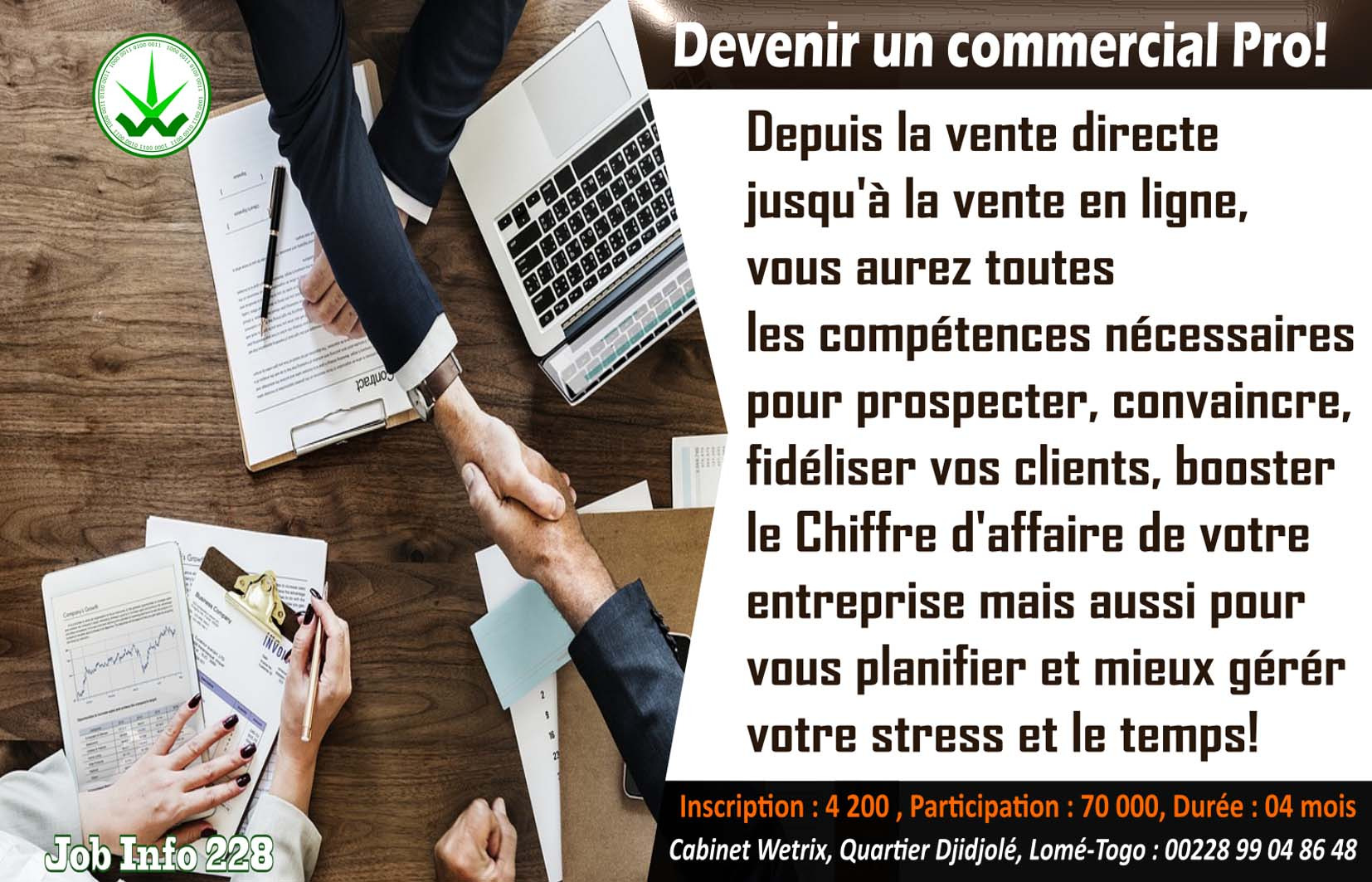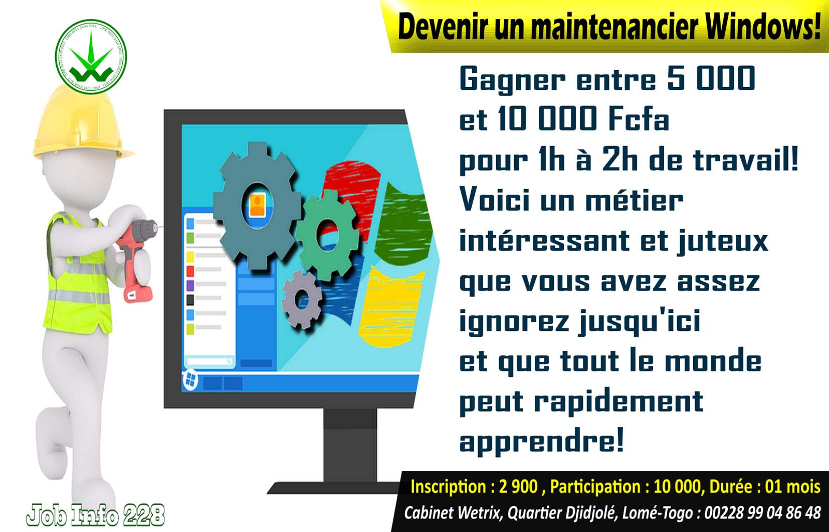 Voici un métier que le Cabinet Wetrix a créé spécialement pour vous permettre de monter un business et gagner de l’argent! C’est un business négligé mais rentable parce que tous ceux qui ont un ordinateur au Togo utilisent probablement le système d’exploitation Windows. Ainsi vous pouvez proposer vos services aux proches qui ont de petits soucis avec leurs logiciels et pourquoi pas aux entreprises! Ici, vous aurez toutes les compétences nécessaires et aussi le matériel dont vous aurez besoin pour le travail…Ne ratez plus votre chance !