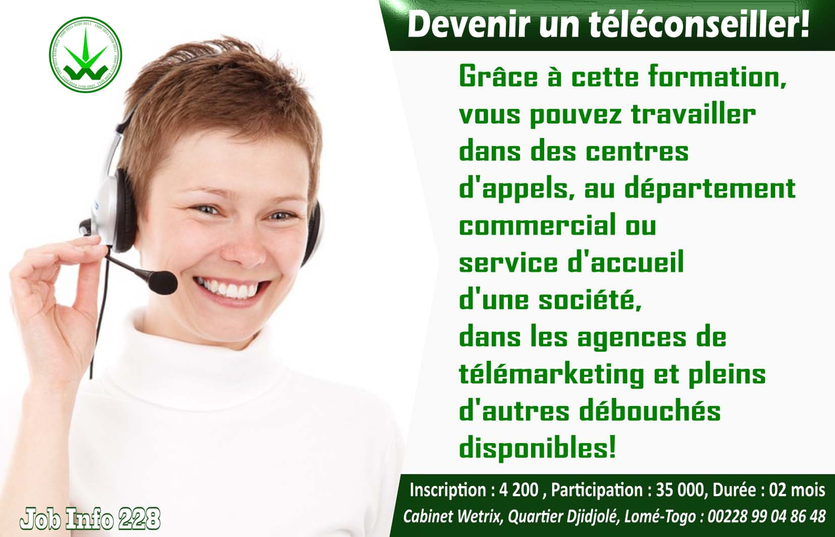 Le téléconseiller est chargé de traiter les contacts des clients ou des prospects d'une société, d'abord par téléphone, en émission ou en réception d’appels, mais aussi par écrit : courrier, email, chat, sms, etc. Son but est de permettre aux entreprises d'avoir des services commerciaux, clientèle ou après-vente centralisés. Son rôle est d'accueillir, de guider, conseiller, vendre, gérer les besoins et les réclamations des contacts. Avec l’essor du e-commerce au Togo, cette fonction est de plus en plus sollicitée par des centres d’appels ou des agences de télémarketing et s’étend à d’autres secteurs. Profitez-en pendant que beaucoup de gens n’en savent pas grandes choses !