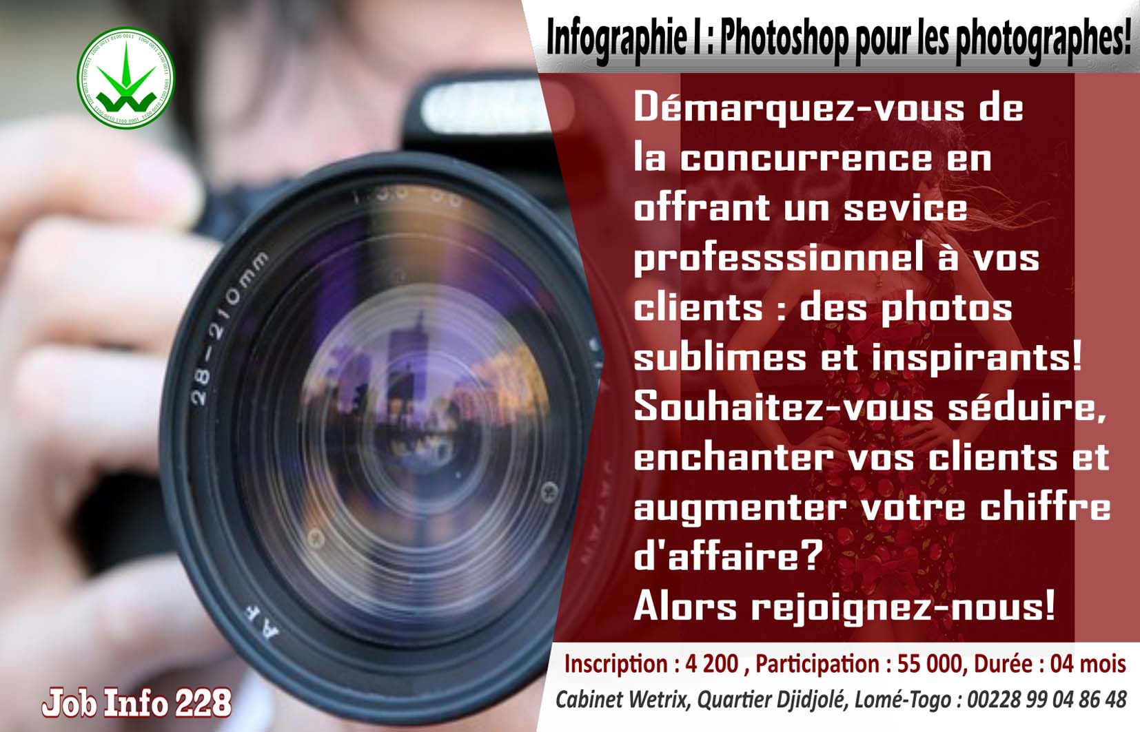 Le métier de shooting photo séduit beaucoup de jeunes au Togo et surtout à Lomé. Beaucoup le font par passion mais vous pouvez aussi bien rentabiliser en travaillant avec professionnalisme. Que vous soyez photographe de mode, photographe de paysage, shooter, ou chasseur d’image, nous vous offrons ici des ateliers pratiques avancés en PHOTOSHOP pour traiter et produire des images sublimes et irréprochables et satisfaire ainsi vos clients quelques soient leurs exigences…voulez-vous faire la différence ? Rejoignez-nous !