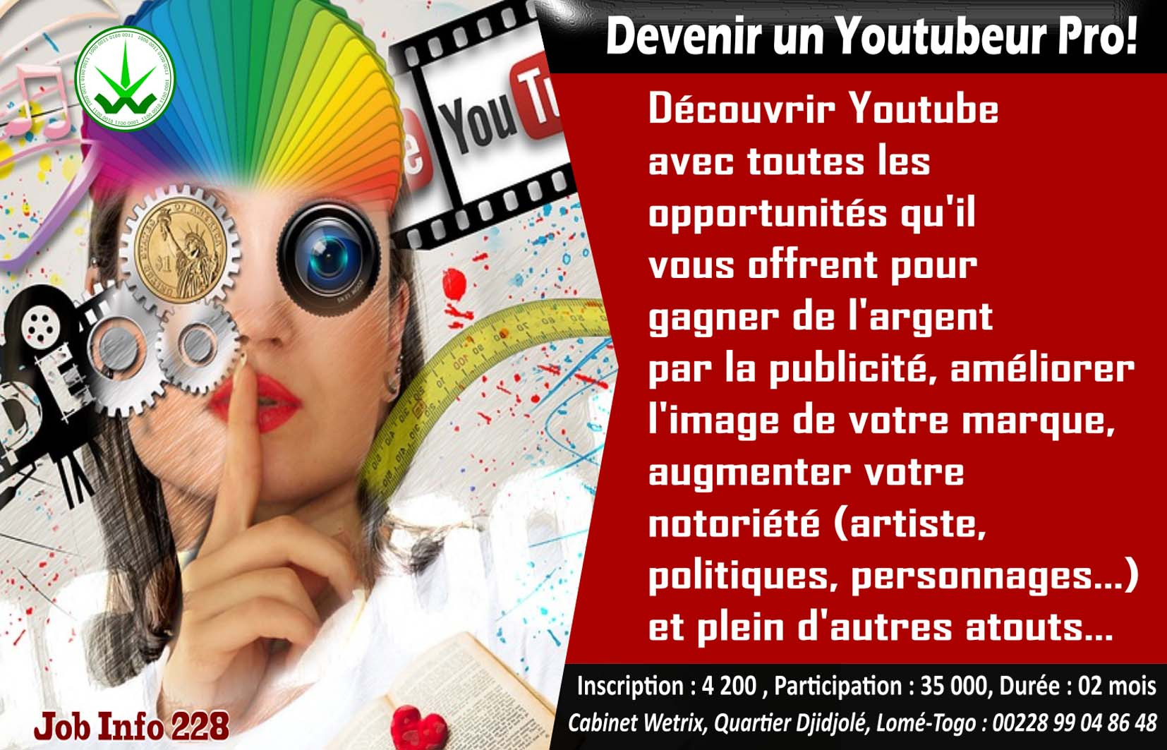 Si les artistes togolais sont prêts à tout pour avoir un bon nombre de vues de leur vidéo sur Youtube, vous comprenez déjà que le showbiz est un marché à conquérir par des Youtubeur Pro et c’est juste un exemple. Devenir Youtubeur Pro vous permet de vivre vos passions mais aussi de rentabiliser grâce à la publicité. Un métier intéressant, mal connu au Togo qui demande des connaissances techniques dans les NTIC, une approche esthétique et une sensibilité, parfois, artistique. Certains grands Youtubeurs vivent entièrement de Youtube alors pourquoi pas vous ?