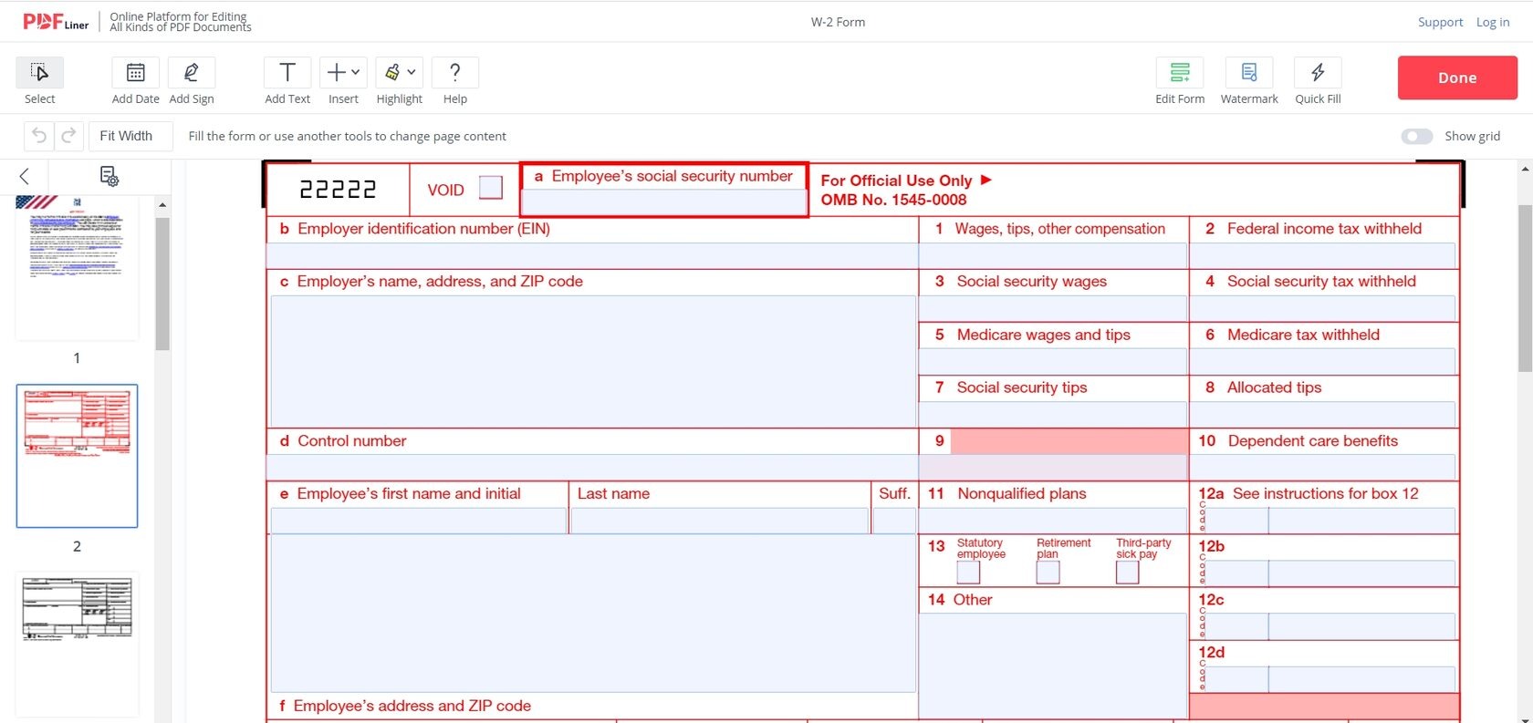 1. Fill in fields a-f with information about the employer's company. Enter SSN, EIN, name, and address. Also, add the company control number, the item where this Form W-2 is recorded in the employer's books.